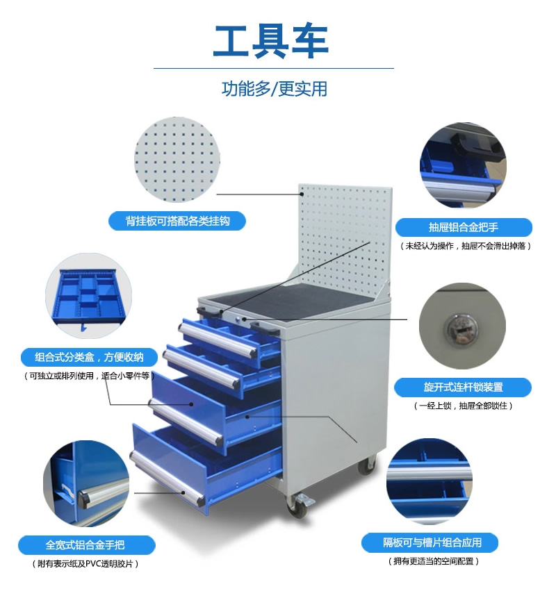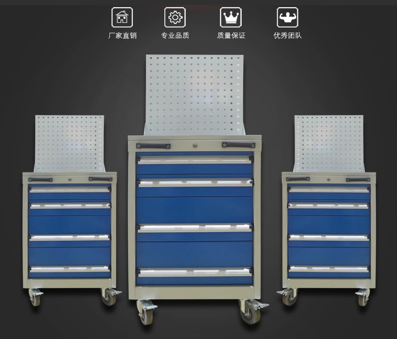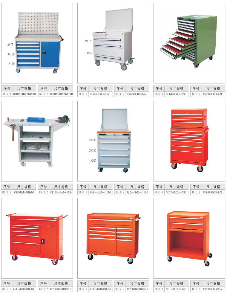 2、工具車由各種型號(hào)的工具柜增加頂柜和腳輪等移動(dòng)部件組成。